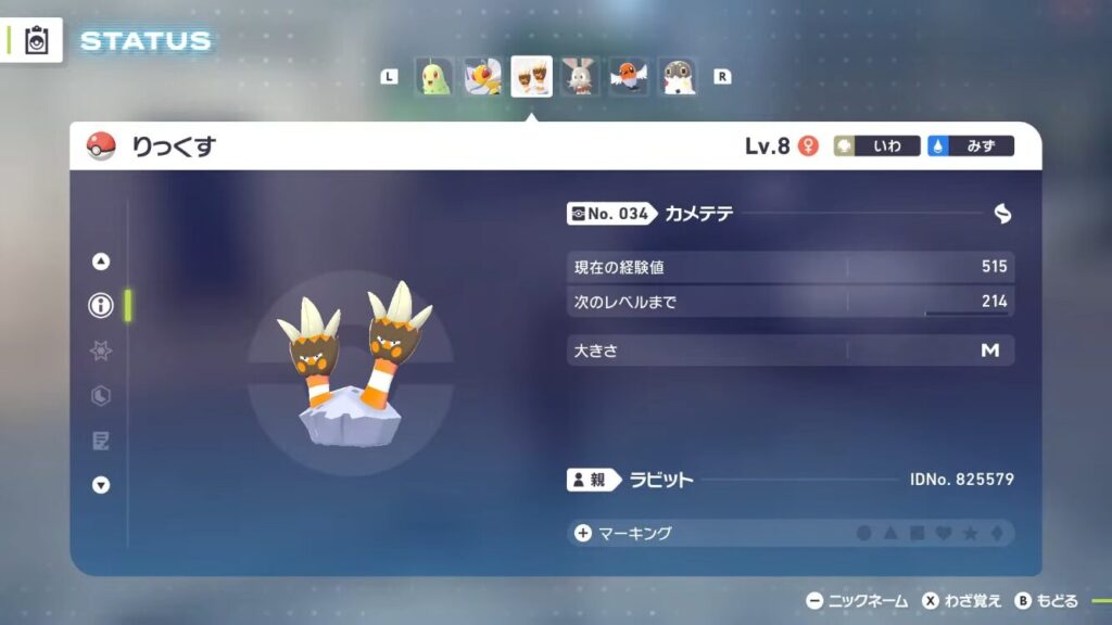 色々と野生ポケモンを捕まえつつストーリーを進め、カメテテの「りっくす」をパーティに加えた。