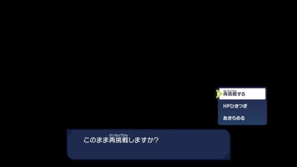 とは言っても、暴走メガシンカポケモンとのバトルでゲームオーバーになってしまった場合「HPひきつぎ」で再挑戦することもできます。